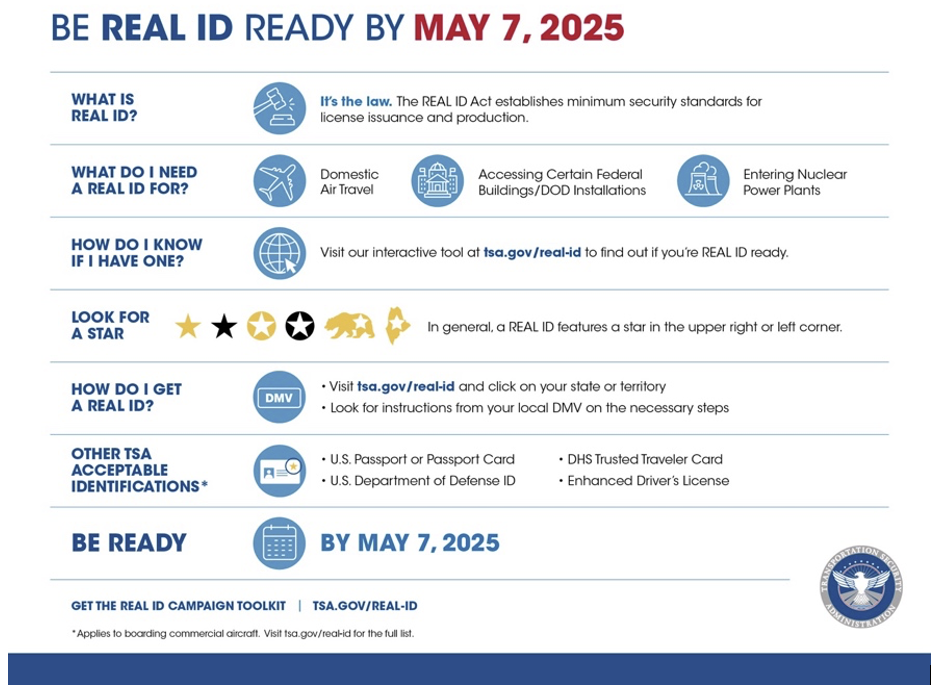 TSA: Starting May 7, 2025, U.S. travelers 18 years of age and older must present a state-issued ID that meets REAL ID requirements to fly within the U.S. For more information, visit https://www.dhs.gov/real-id