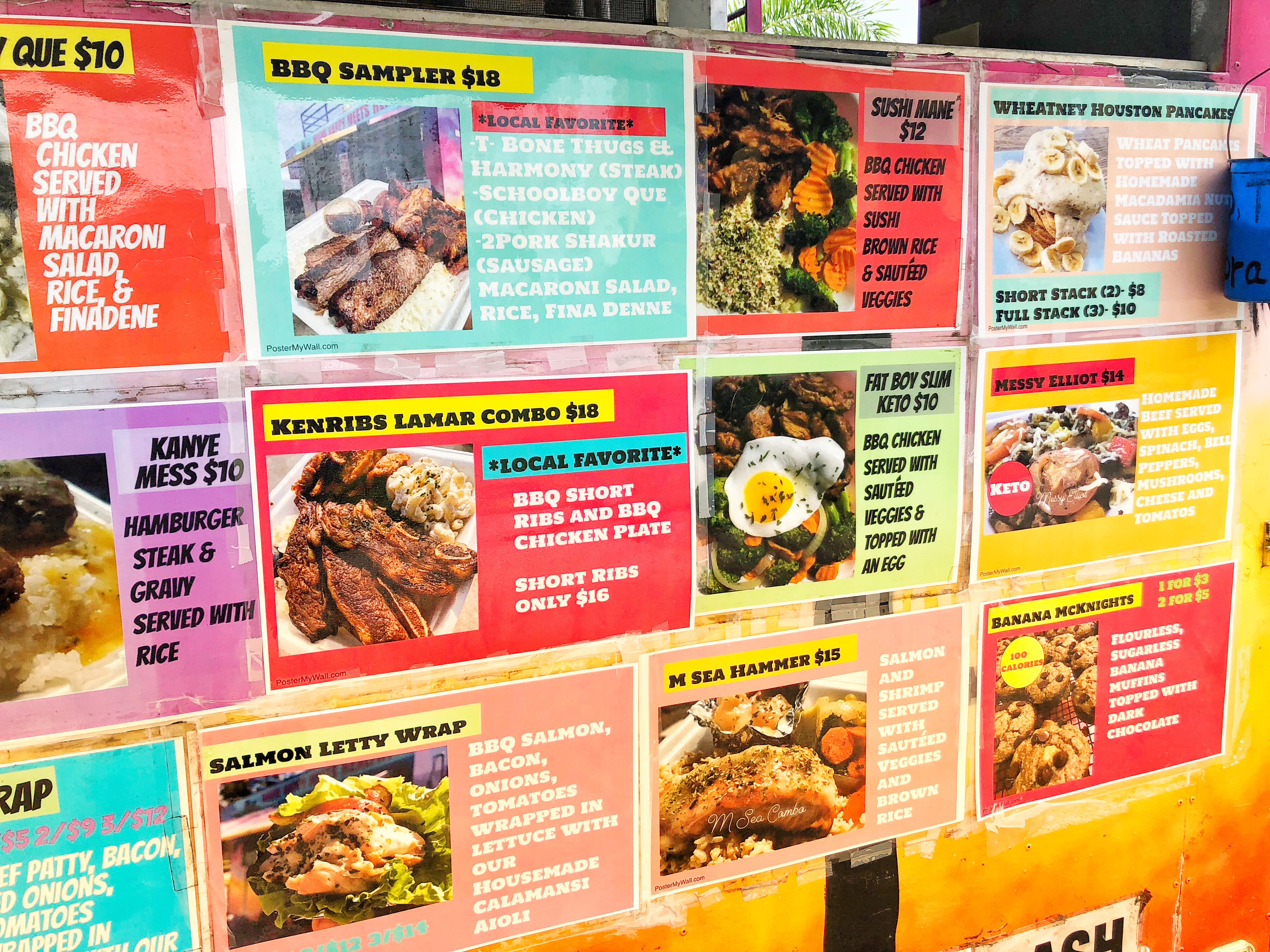 Walking up to the Fat Boy Slim food truck can be quite overwhelming not just because all of the food looks amazing, but the clever names for their dishes are a play on names of famous musicians and performers. “Sushi Mane”, “Notorious P.I.G.”, “M Sea Hammer”, “Kanye Mess” and “WHEATney Houston Pancakes” are all on the menu and then some.